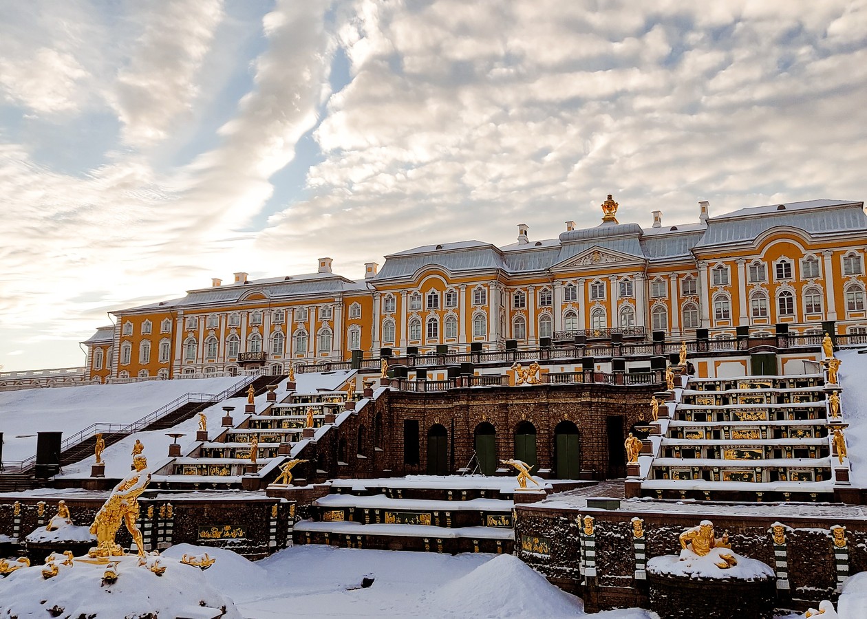 В Петергофе совершите небольшую прогулку по парку и посетите Большой дворец. Рассмотрите его богато украшенные интерьеры с многочисленными произведениями искусства и послушаете о венценосных обитателях.